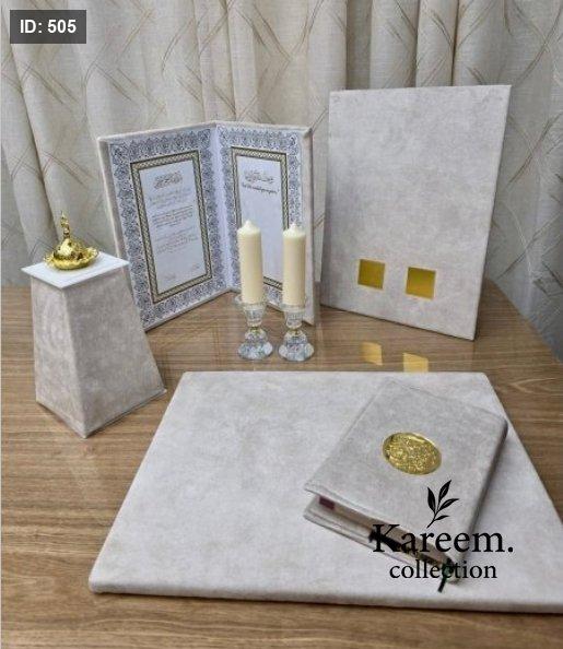 بكج العرسان ( قماش ) مصحف & قاعدة لتقديم الدبل & ستاند بصمة & كتاب البصمة & مبخرة & شمعدان كرستال عدد 2